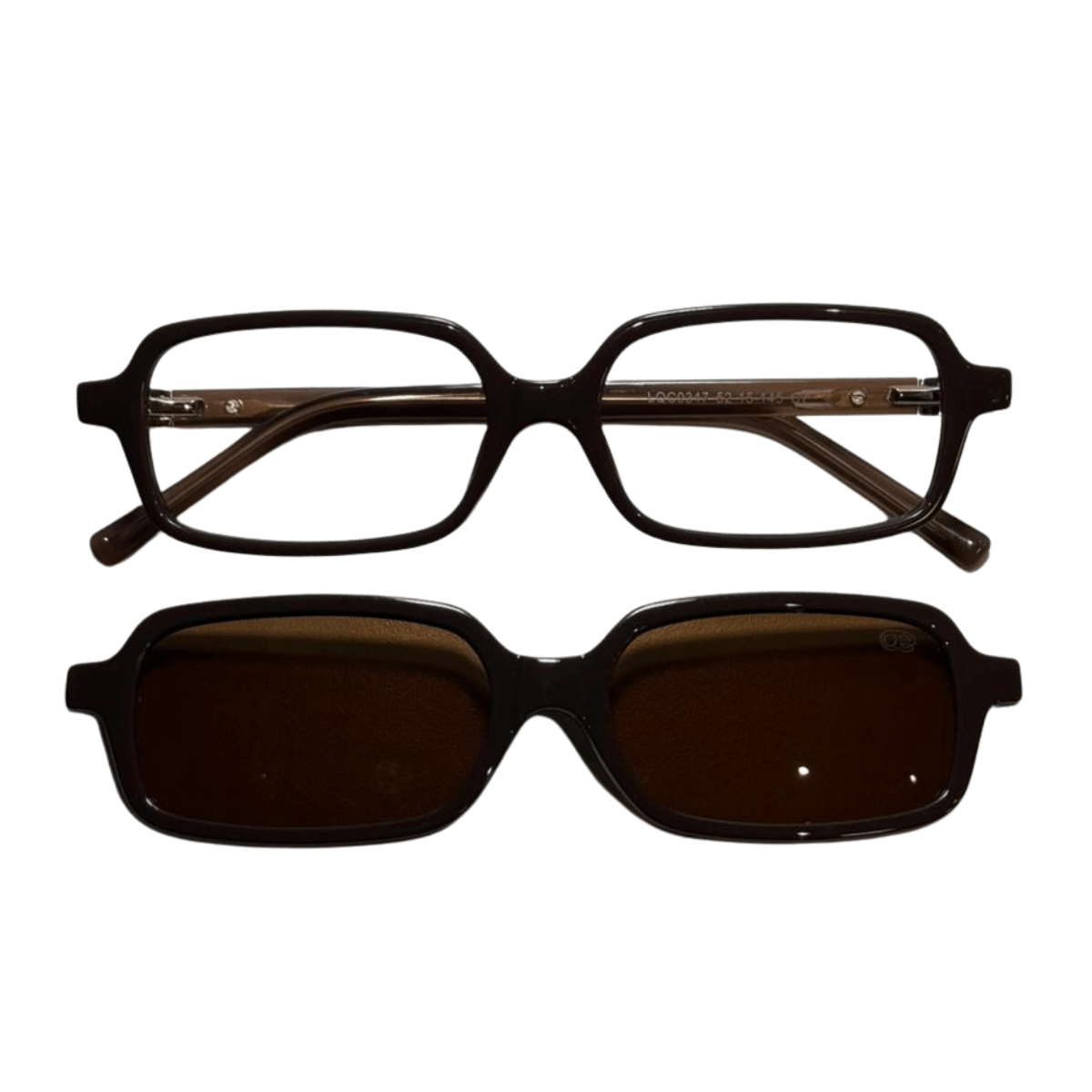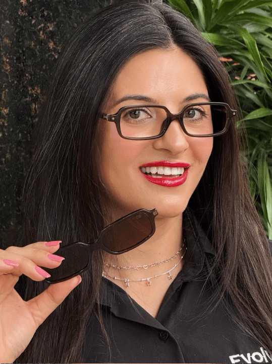 Óculos de grau feminino clip-on, modelo 2 em 1 em acetato com hastes em acetato, em formato quadrado, o óculos Evolve é a escolha perfeita para quem busca tendência e praticidade, pois sua versatilidade permite a troca rápida entre as lentes de grau e o clip-on solar.