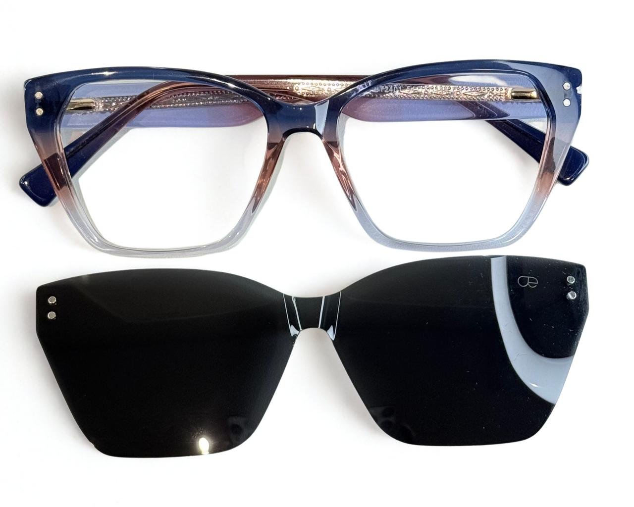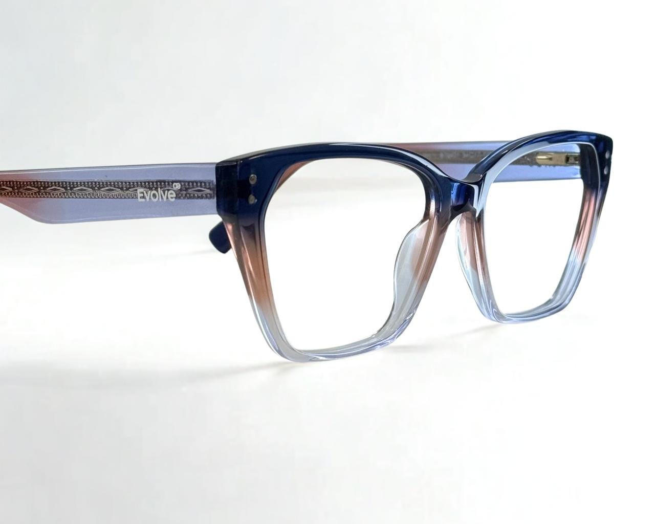Óculos de grau feminino clip-on, modelo 2 em 1 em acetato, com hastes em acetato, em formato quadrado com um leve acentuado nas sobrancelhas para harmonizar melhor a expressão facial, o óculos Evolve é a escolha perfeita para quem busca praticidade e elegância no dia a dia, pois sua versatilidade permite a troca rápida entre as lentes de grau e o clip-on solar.