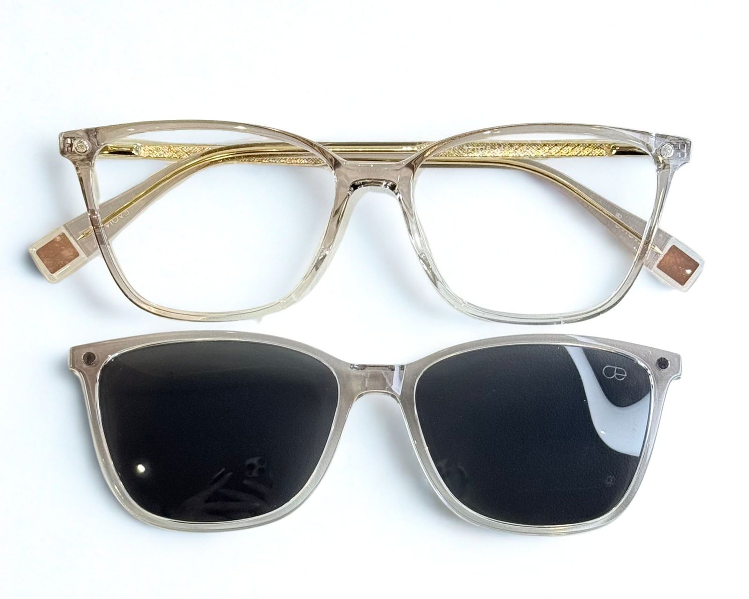 Óculos de grau feminino clip-on, modelo 2 em 1 em acetato com hastes em acetato, em formato quadrado com um leve acentuado nas sobrancelhas para harmonizar melhor a expressão facial, o óculos Evolve é a escolha perfeita para quem busca praticidade e elegância no dia a dia, pois sua versatilidade permite a troca rápida entre as lentes de grau e o clip-on solar.