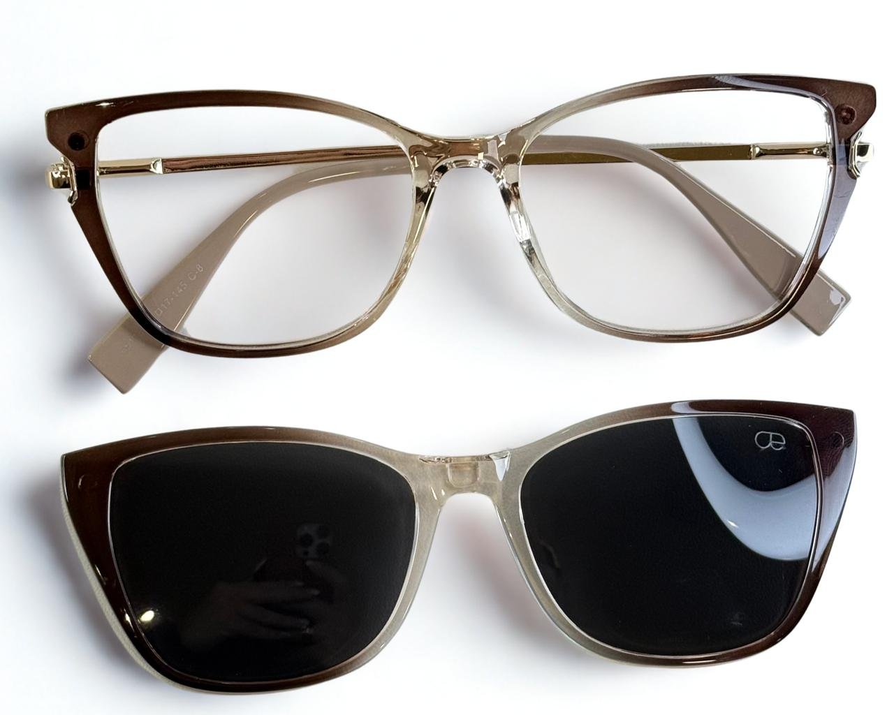 Óculos de grau feminino clip-on, modelo 2 em 1 em acetato com hastes em acetato, em formato quadrado com um acentuado nas sobrancelhas para harmonizar melhor a expressão facial, o óculos Evolve é a escolha perfeita para quem busca praticidade e elegância no dia a dia, pois sua versatilidade permite a troca rápida entre as lentes de grau e o clip-on solar.