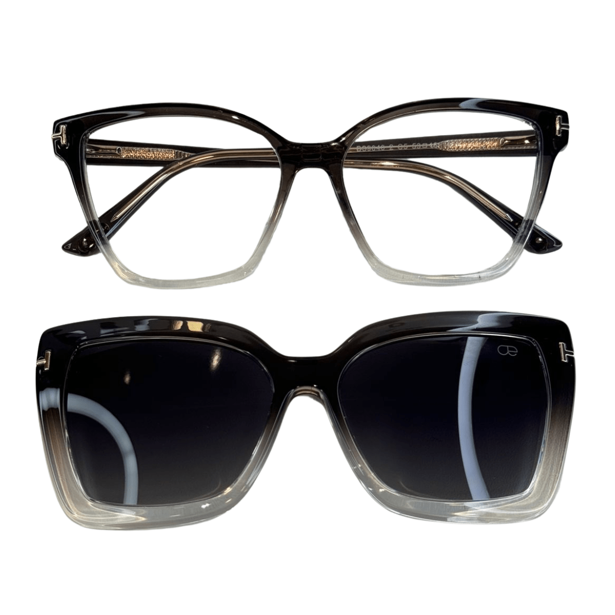 Óculos de grau feminino clip-on, modelo 2 em 1 em acetato com hastes em acetato, em formato quadrado com um acentuado nas sobrancelhas para harmonizar melhor a expressão facial, o óculos Evolve é a escolha perfeita para quem busca praticidade e elegância no dia a dia, pois sua versatilidade permite a troca rápida entre as lentes de grau e o clip-on solar.
