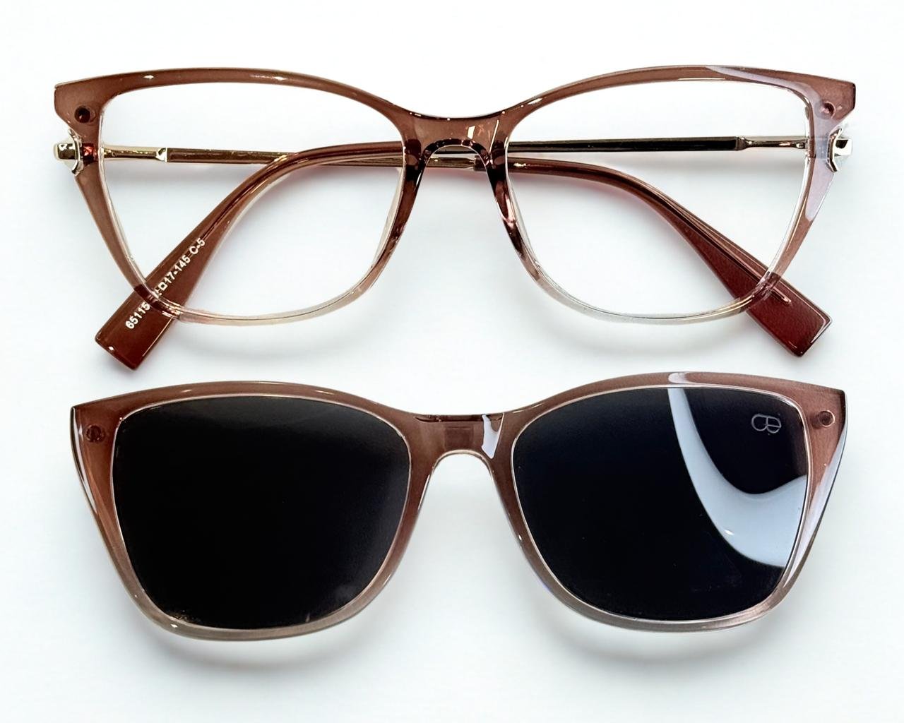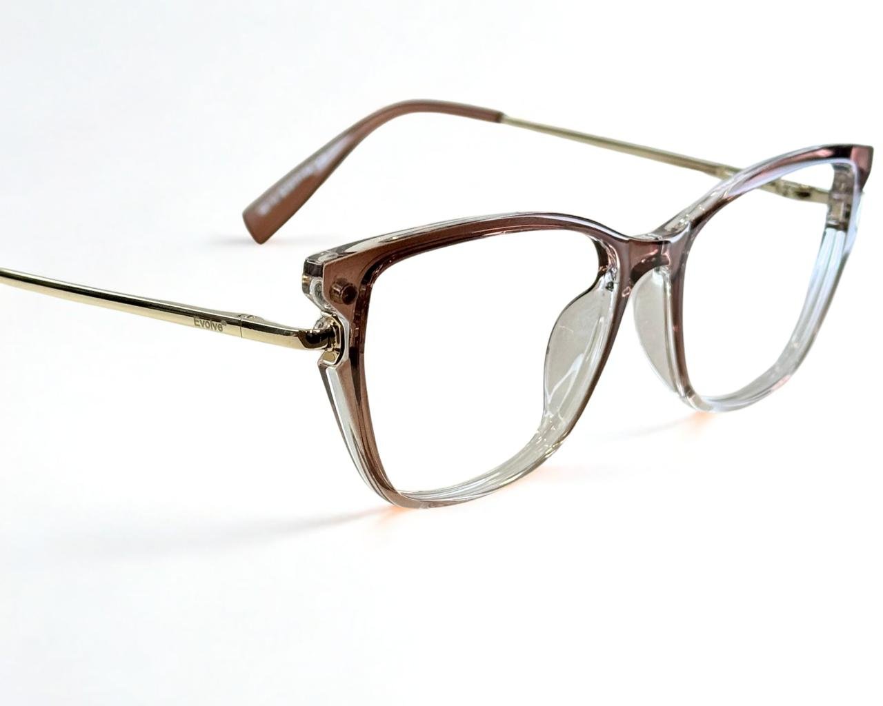 Óculos de grau feminino clip-on, modelo 2 em 1 em acetato, com hastes em metal com a ponteira em acetato, em formato quadrado com um leve acentuado nas sobrancelhas para harmonizar melhor a expressão facial, o óculos Evolve é a escolha perfeita para quem busca praticidade e elegância no dia a dia, pois sua versatilidade permite a troca rápida entre as lentes de grau e o clip-on solar.