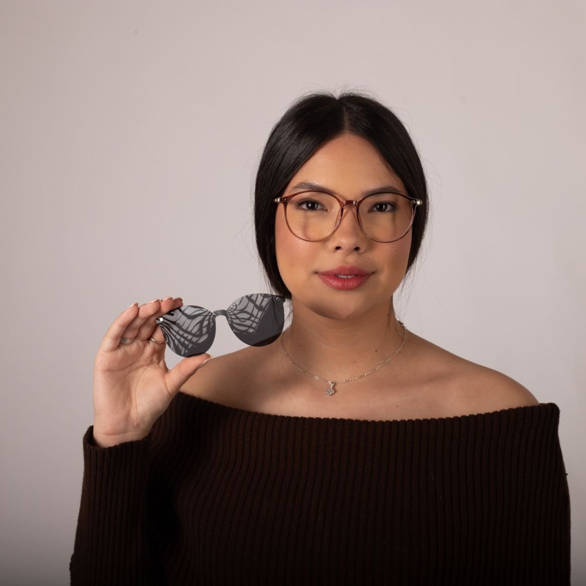 Óculos de grau feminino clip-on, modelo 2 em 1 em acetato, com hastes em acetato, em formato redondo, o óculos Evolve é a escolha perfeita para quem busca praticidade e elegância no dia a dia, pois sua versatilidade permite a troca rápida entre as lentes de grau e o clip-on solar.