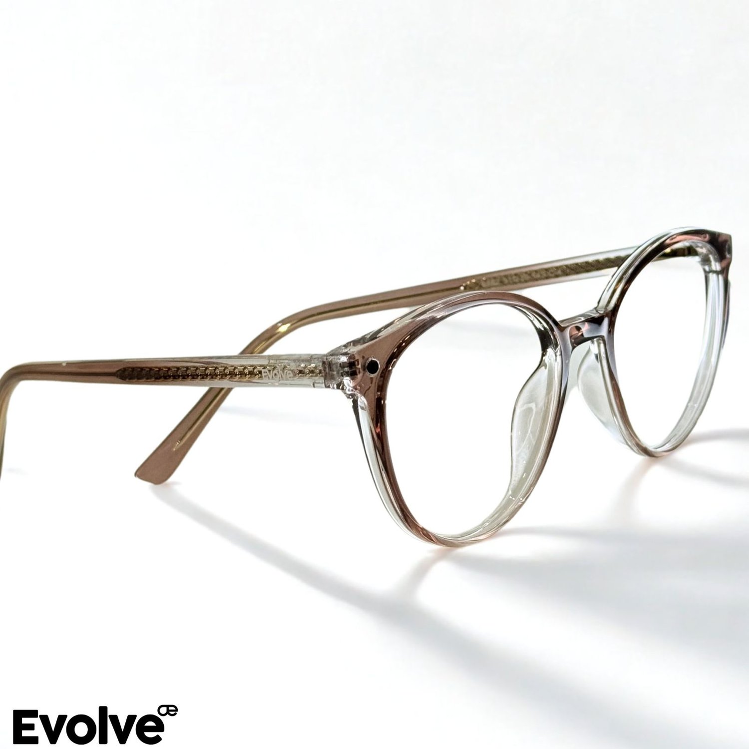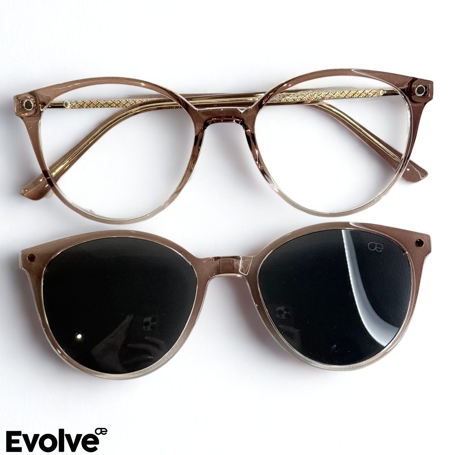 Óculos de grau feminino clip-on, modelo 2 em 1 em acetato com hastes em acetato em formato redondo com um leve acentuado nas sobrancelhas para harmonizar melhor a expressão facial, o óculos Evolve é a escolha perfeita para quem busca praticidade e elegância no dia a dia, pois sua versatilidade permite a troca rápida entre as lentes de grau e o clip-on solar.