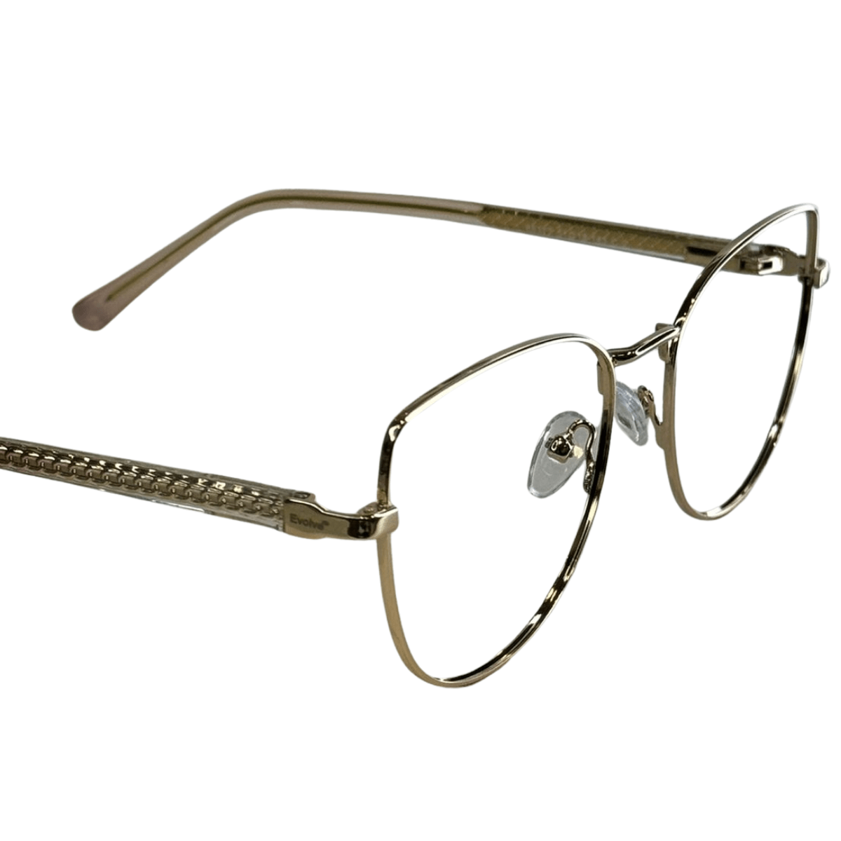 Óculos de grau feminino clip-on, modelo 2 em 1 em metal com hastes em metal, em formato quadrado com um acentuado nas sobrancelhas para harmonizar melhor a expressão facial, o óculos Evolve é a escolha perfeita para quem busca praticidade e elegância no dia a dia, pois sua versatilidade permite a troca rápida entre as lentes de grau e o clip-on solar.