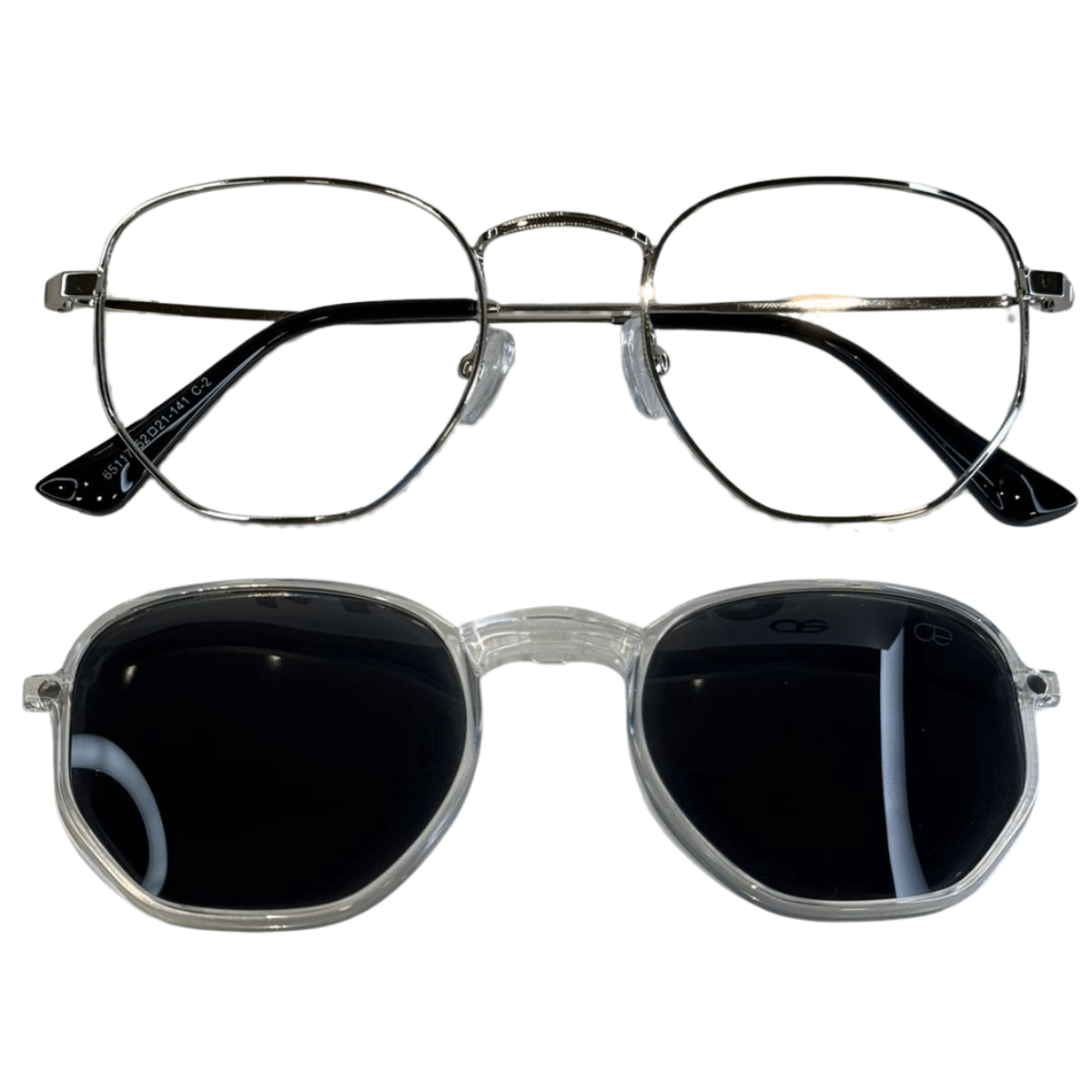 Óculos de grau feminino clip-on, modelo 2 em 1 em metal com hastes em acetato, em formato hexagonal, o óculos Evolve é a escolha perfeita para quem busca praticidade e elegância no dia a dia, pois sua versatilidade permite a troca rápida entre as lentes de grau e o clip-on solar.
