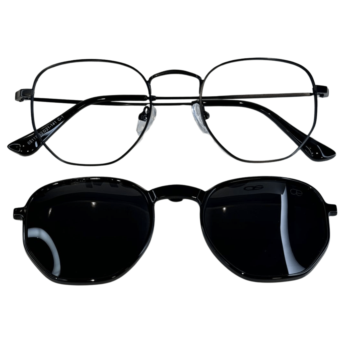 Óculos de grau feminino clip-on, modelo 2 em 1 em metal com hastes em acetato, em formato hexagonal, o óculos Evolve é a escolha perfeita para quem busca praticidade e elegância no dia a dia, pois sua versatilidade permite a troca rápida entre as lentes de grau e o clip-on solar.