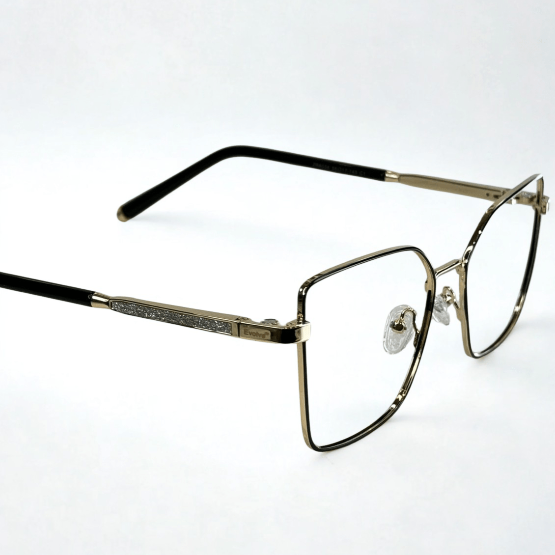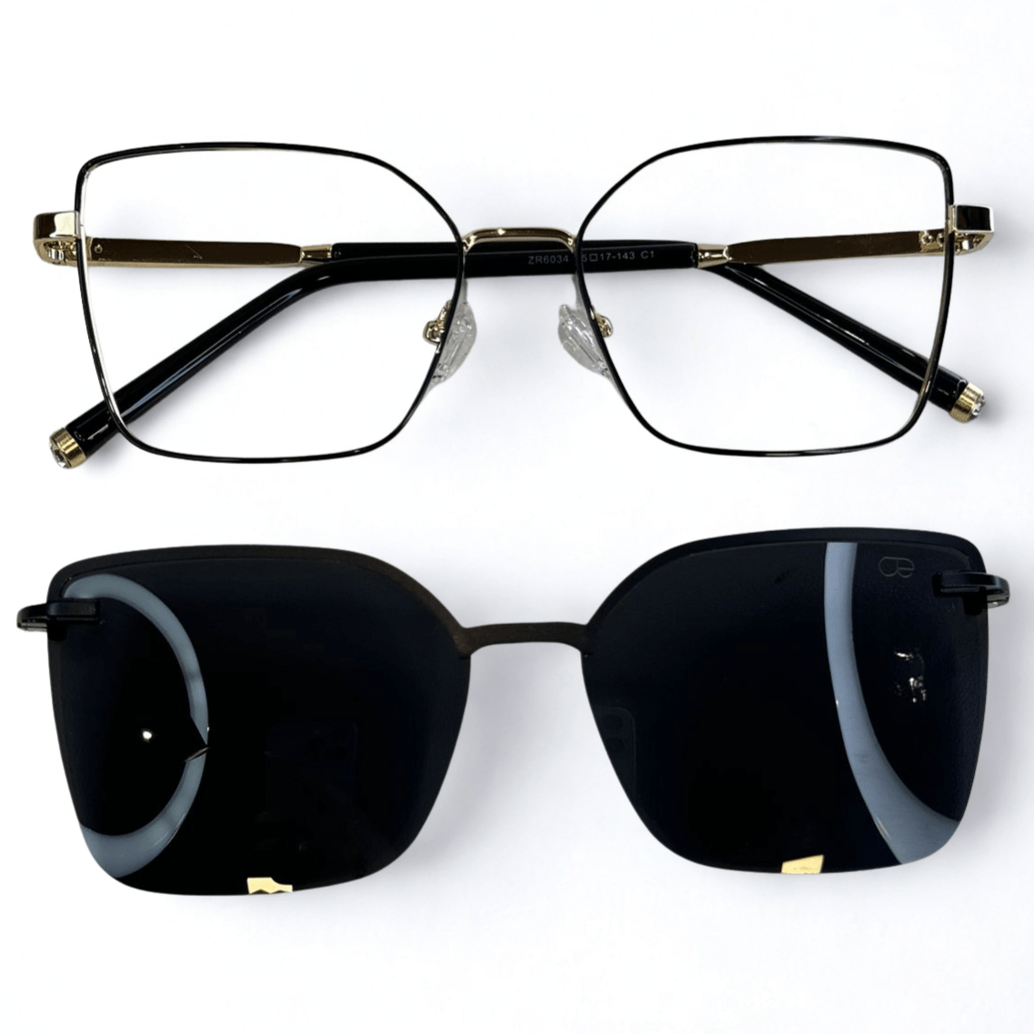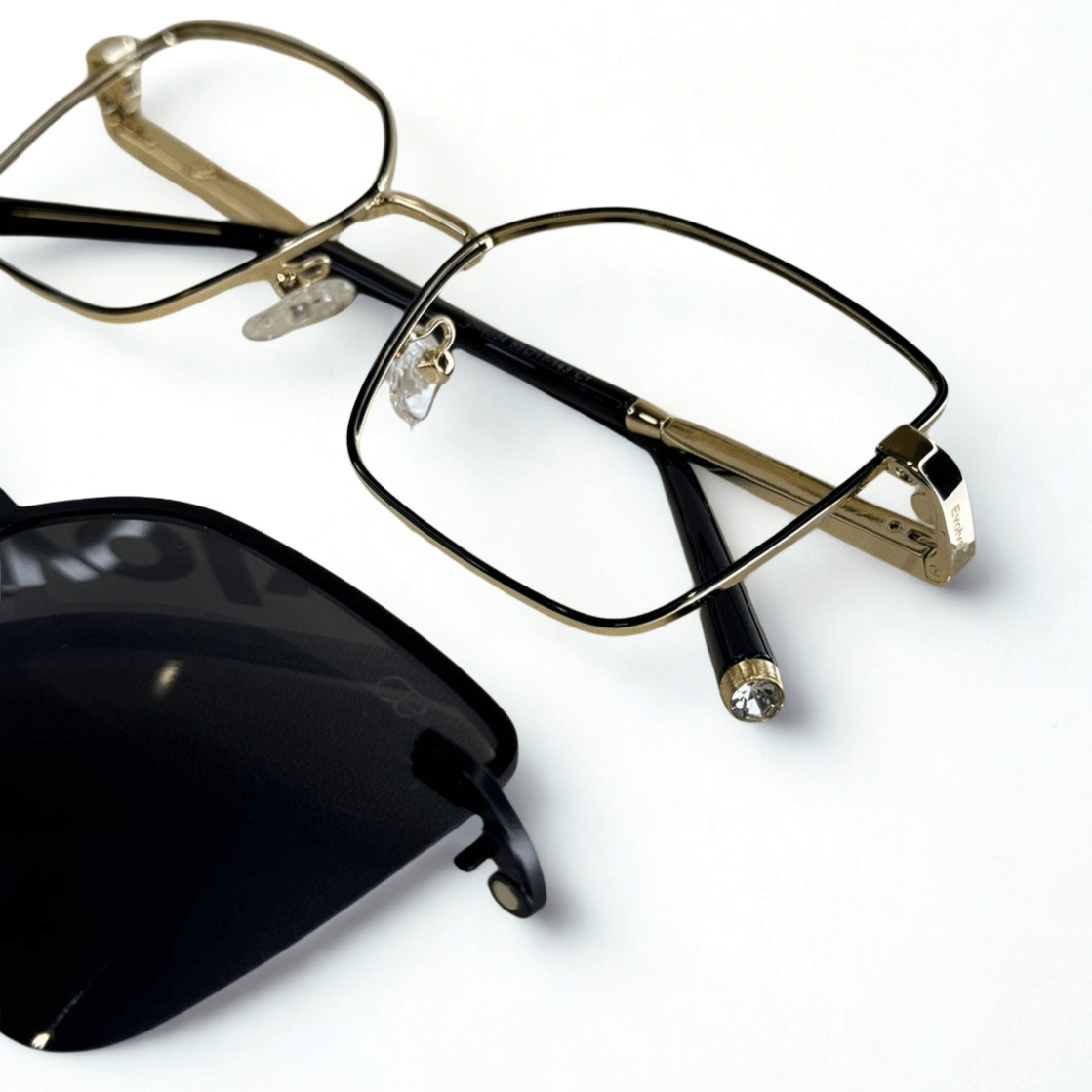Óculos de grau feminino clip-on, modelo 2 em 1 em metal com hastes em metal, em formato quadrado com um acentuado nas sobrancelhas para harmonizar melhor a expressão facial, o óculos Evolve é a escolha perfeita para quem busca praticidade e elegância no dia a dia, pois sua versatilidade permite a troca rápida entre as lentes de grau e o clip-on solar.