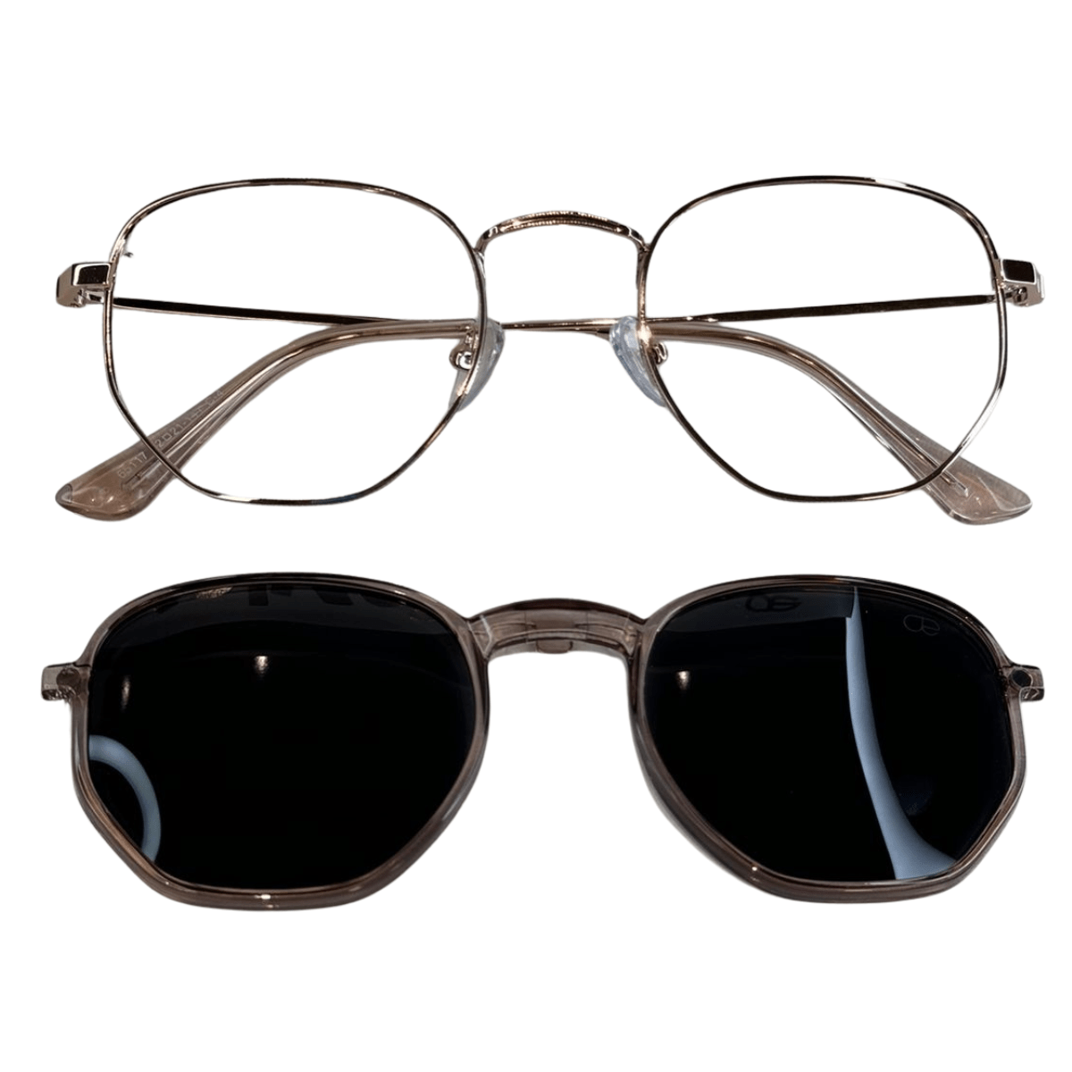 Óculos de grau feminino clip-on, modelo 2 em 1 em metal com hastes em acetato, em formato hexagonal, o óculos Evolve é a escolha perfeita para quem busca praticidade e elegância no dia a dia, pois sua versatilidade permite a troca rápida entre as lentes de grau e o clip-on solar.
