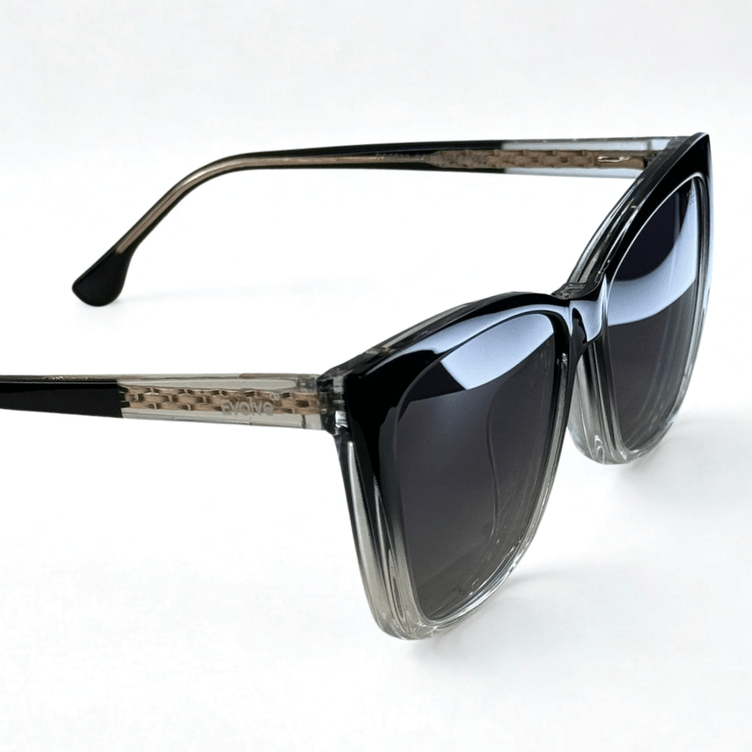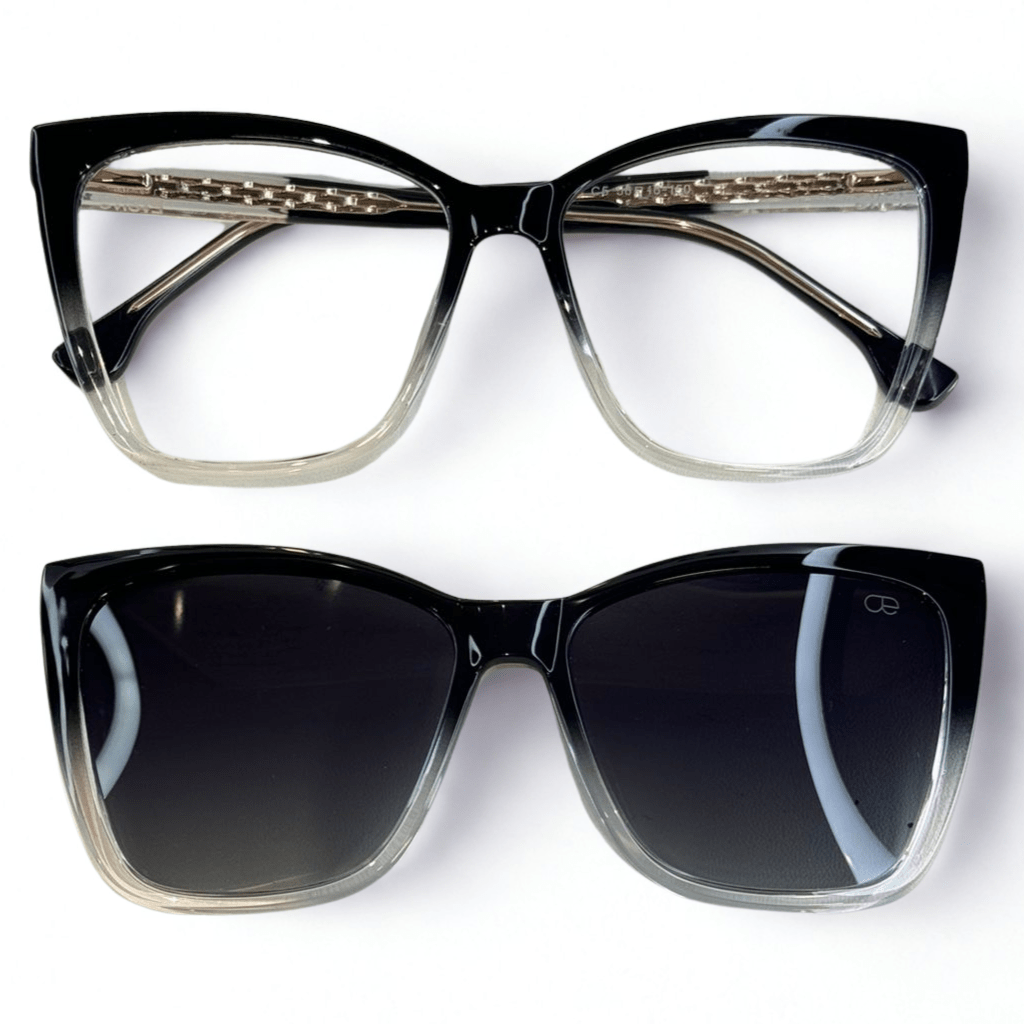 Óculos de grau feminino clip-on, modelo 2 em 1 em acetato com hastes em acetato, em formato quadrado com um acentuado nas sobrancelhas para harmonizar melhor a expressão facial, o óculos Evolve é a escolha perfeita para quem busca praticidade e elegância no dia a dia, pois sua versatilidade permite a troca rápida entre as lentes de grau e o clip-on solar.