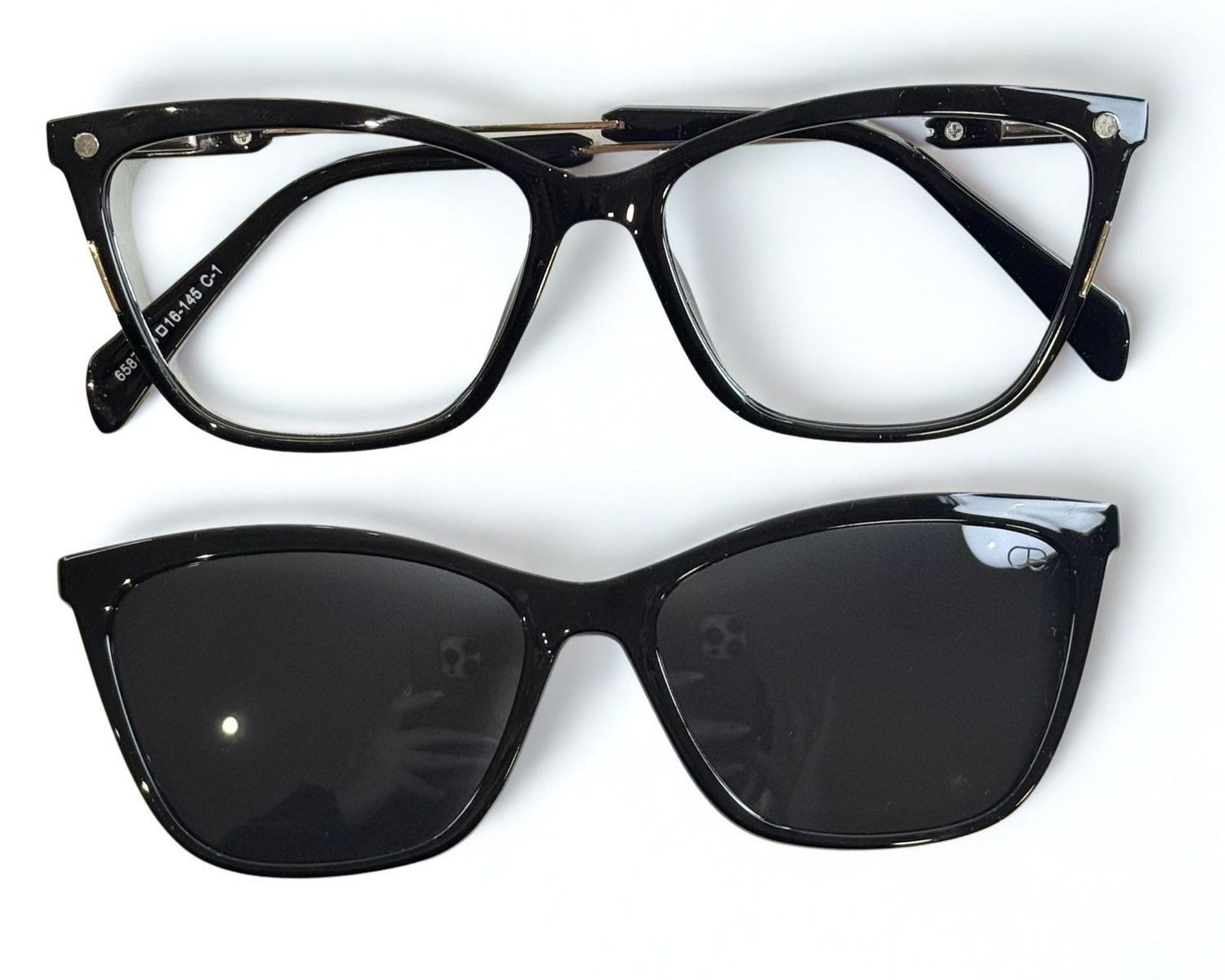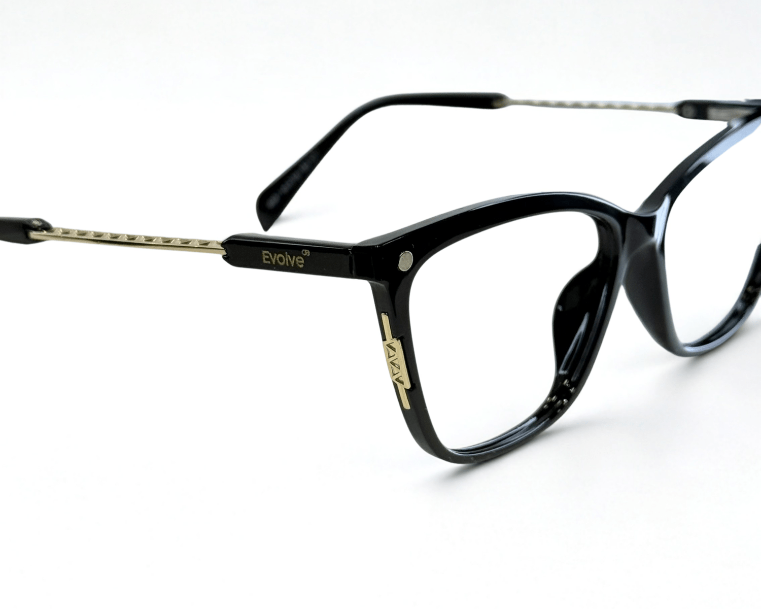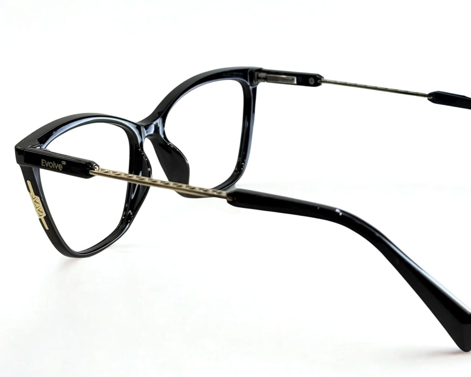 Óculos de grau feminino clip-on, modelo 2 em 1 em acetato, com hastes em acetato com detalhe em metal, em formato quadrado com um leve acentuado nas sobrancelhas para harmonizar melhor a expressão facial, o óculos Evolve é a escolha perfeita para quem busca praticidade e elegância no dia a dia, pois sua versatilidade permite a troca rápida entre as lentes de grau e o clip-on solar.