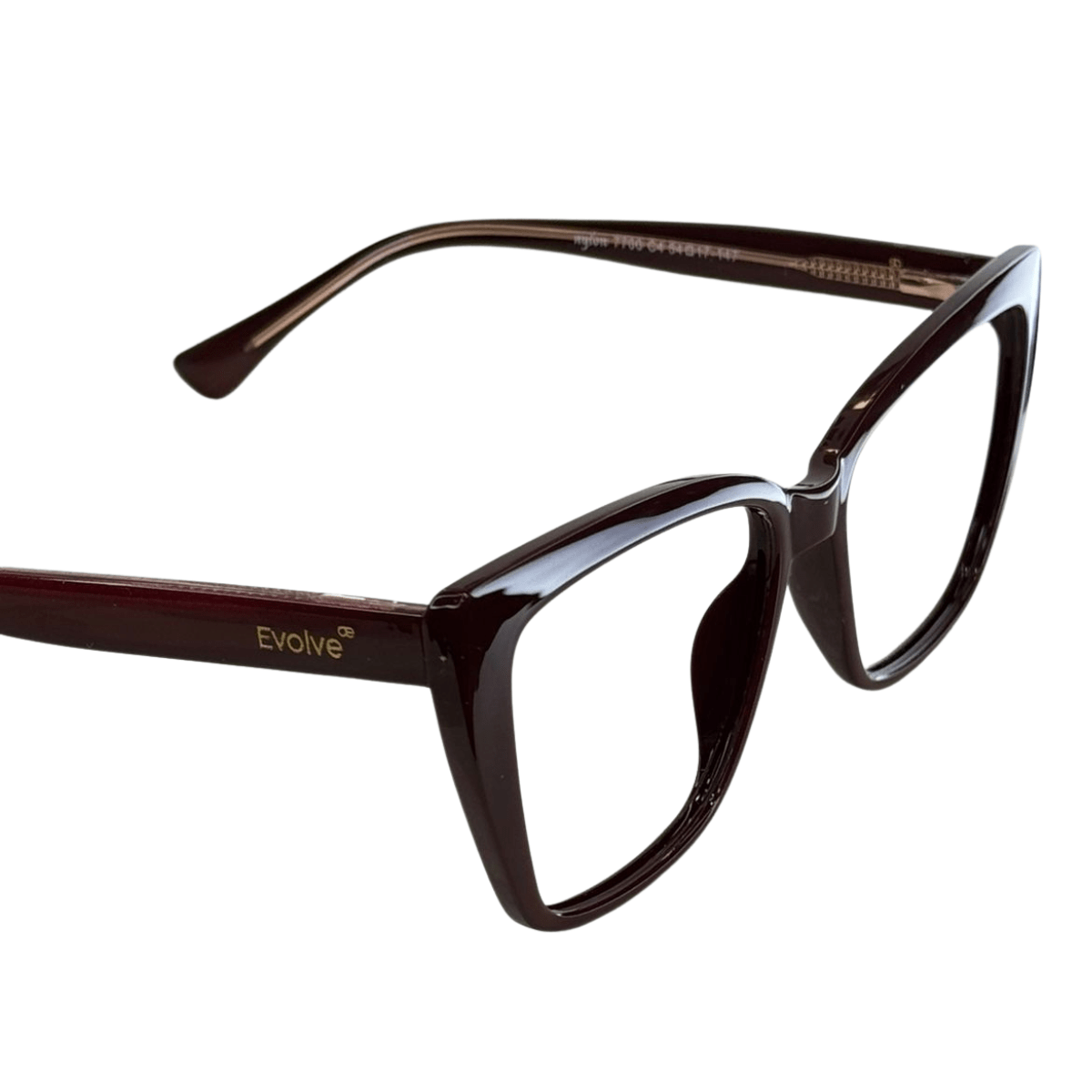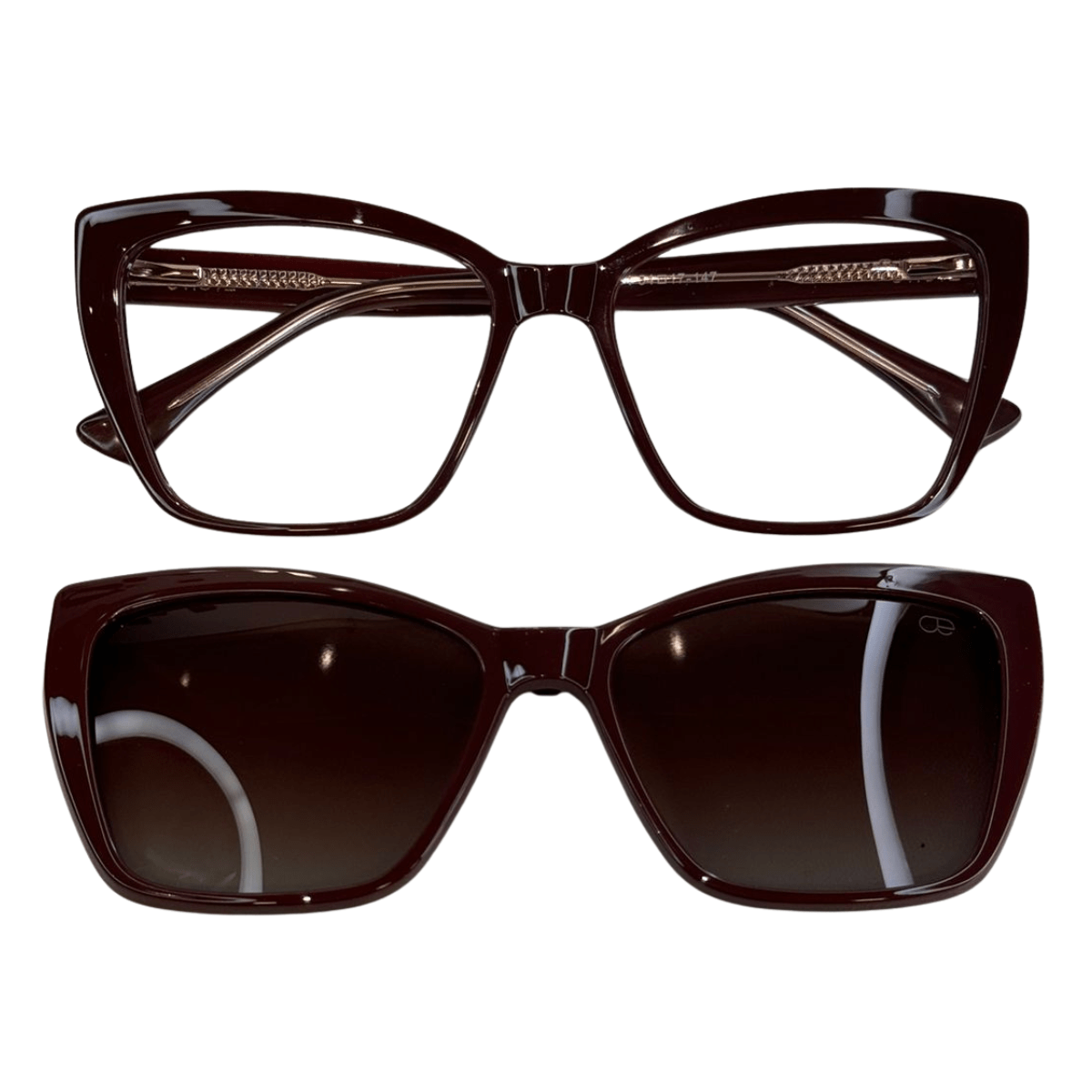 Óculos de grau feminino clip-on, modelo 2 em 1 em acetato com hastes em acetato, em formato quadrado com um acentuado nas sobrancelhas para harmonizar melhor a expressão facial, o óculos Evolve é a escolha perfeita para quem busca praticidade e elegância no dia a dia, pois sua versatilidade permite a troca rápida entre as lentes de grau e o clip-on solar.