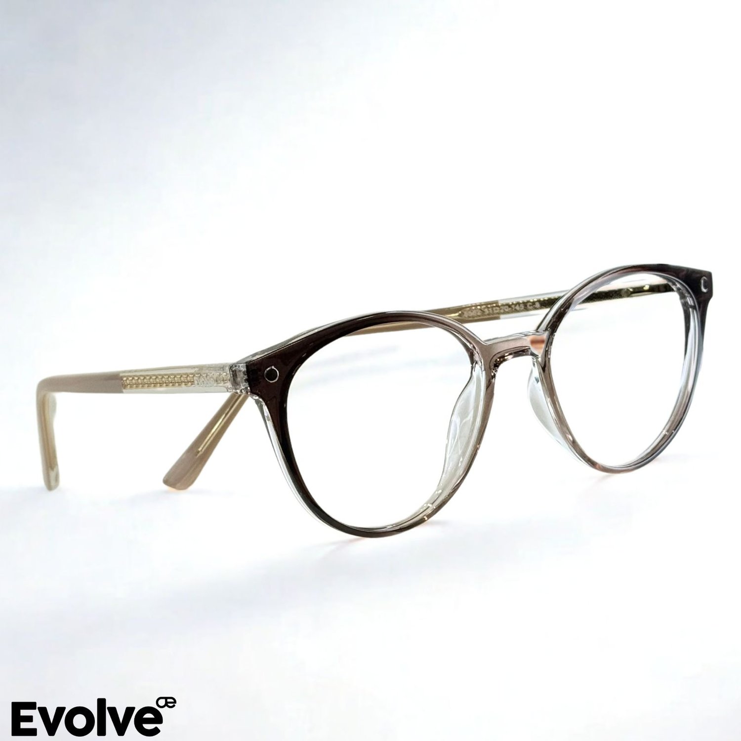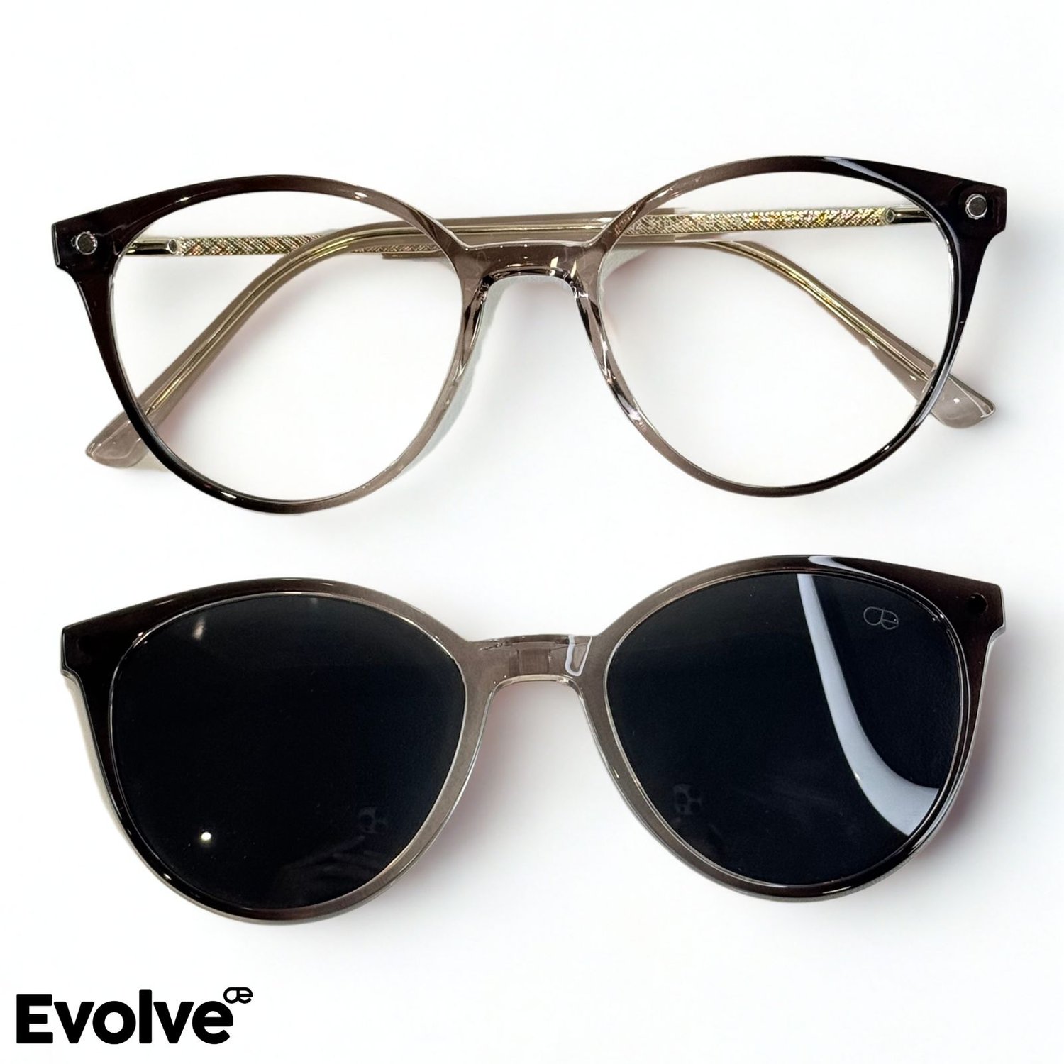 Óculos de grau feminino clip-on, modelo 2 em 1 em acetato com hastes em acetato em formato redondo com um leve acentuado nas sobrancelhas para harmonizar melhor a expressão facial, o óculos Evolve é a escolha perfeita para quem busca praticidade e elegância no dia a dia, pois sua versatilidade permite a troca rápida entre as lentes de grau e o clip-on solar.