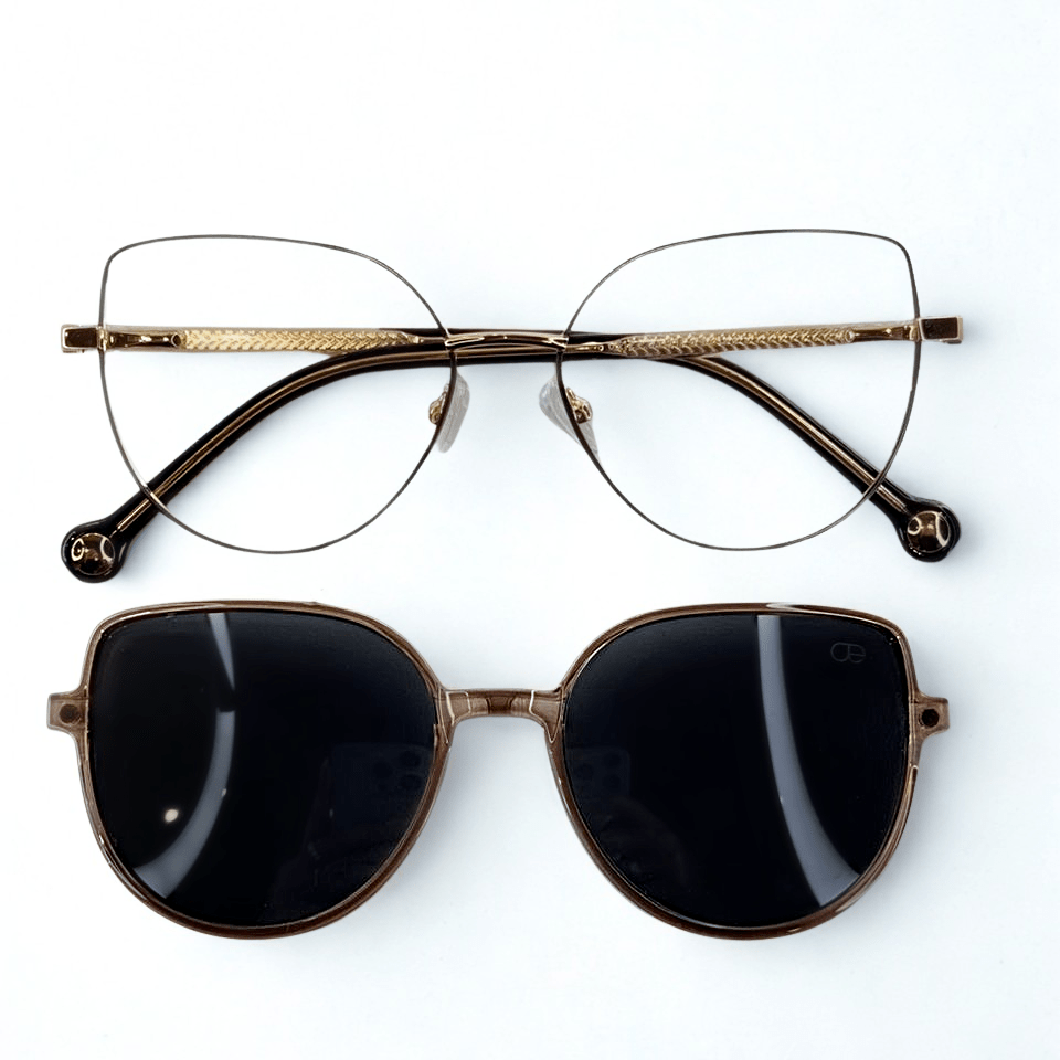 Óculos de grau feminino clip-on, modelo 2 em 1 em metal com hastes em acetato, em formato redondo com um acentuado nas sobrancelhas para harmonizar melhor a expressão facial, o óculos Evolve é a escolha perfeita para quem busca praticidade e elegância no dia a dia, pois sua versatilidade permite a troca rápida entre as lentes de grau e o clip-on solar.