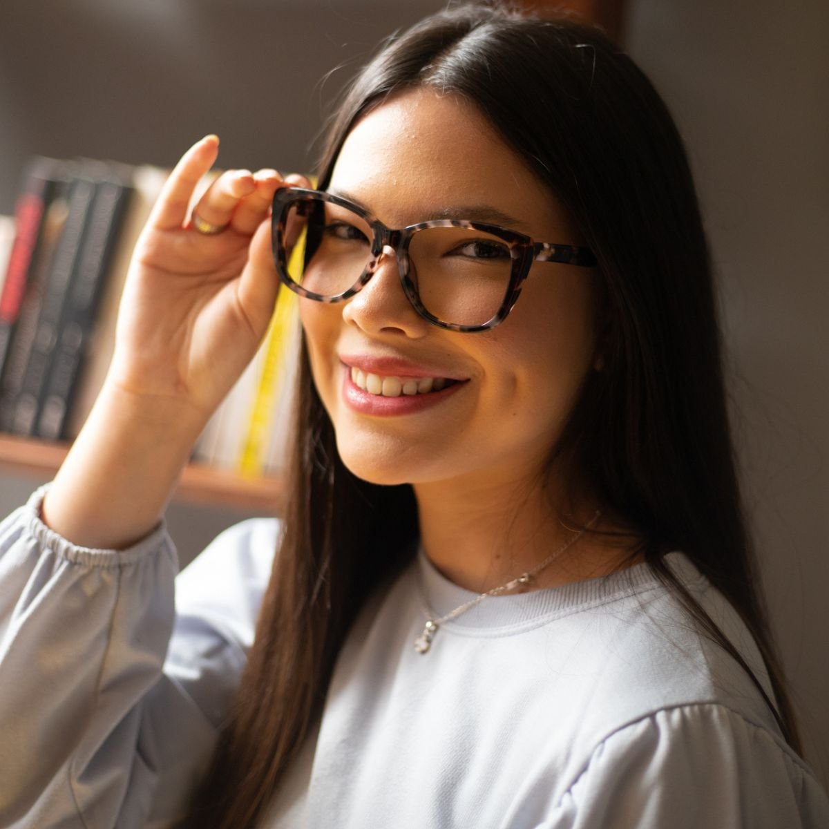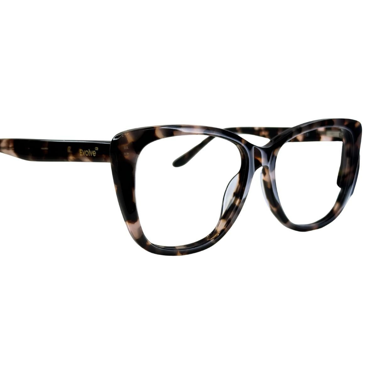 Óculos de grau feminino em tartarugado, em acetato, com hastes em acetato, em formato gatinho com um leve acentuado nas sobrancelhas para harmonizar melhor a expressão facial, o óculos Evolve é a escolha perfeita para quem busca praticidade e elegância no dia a dia.