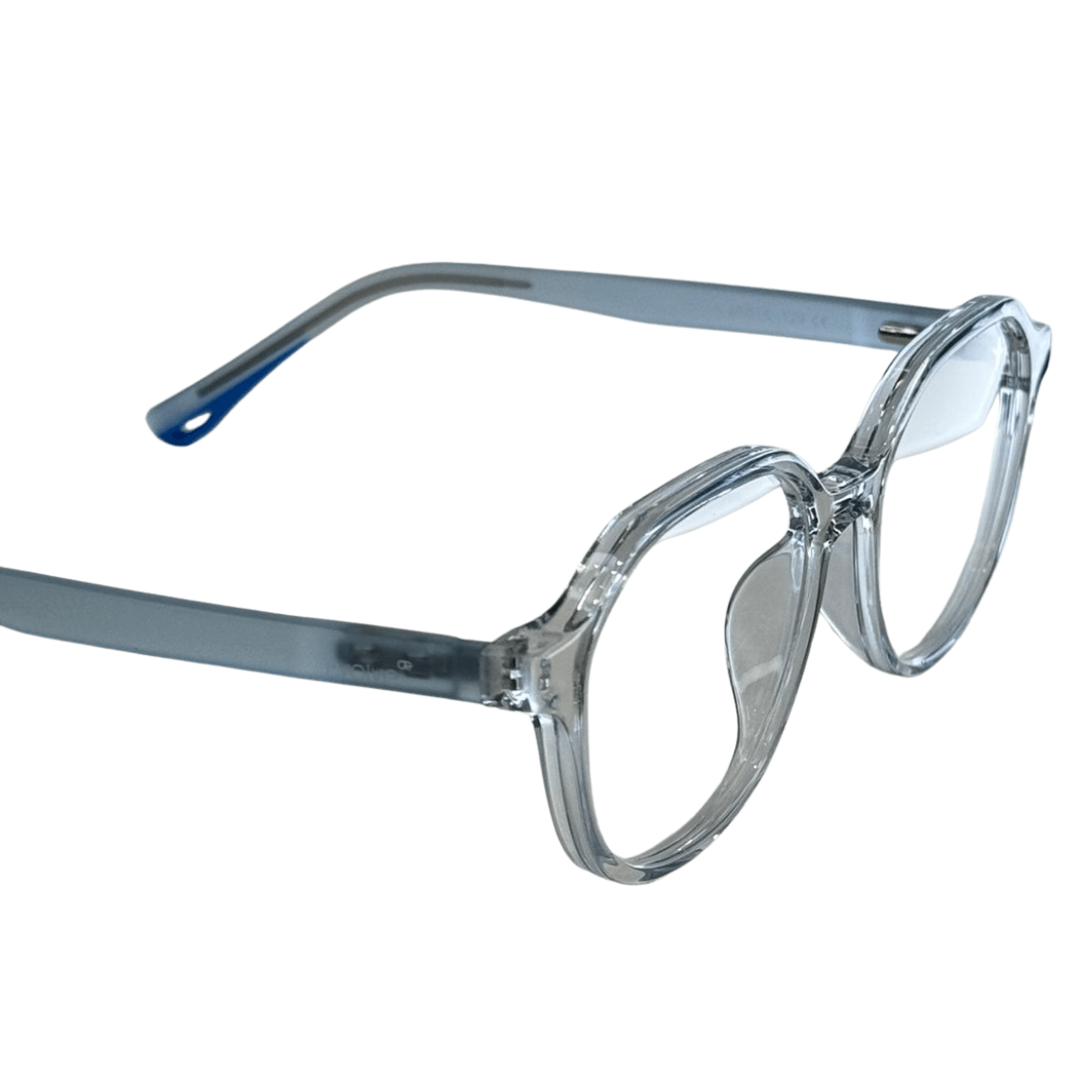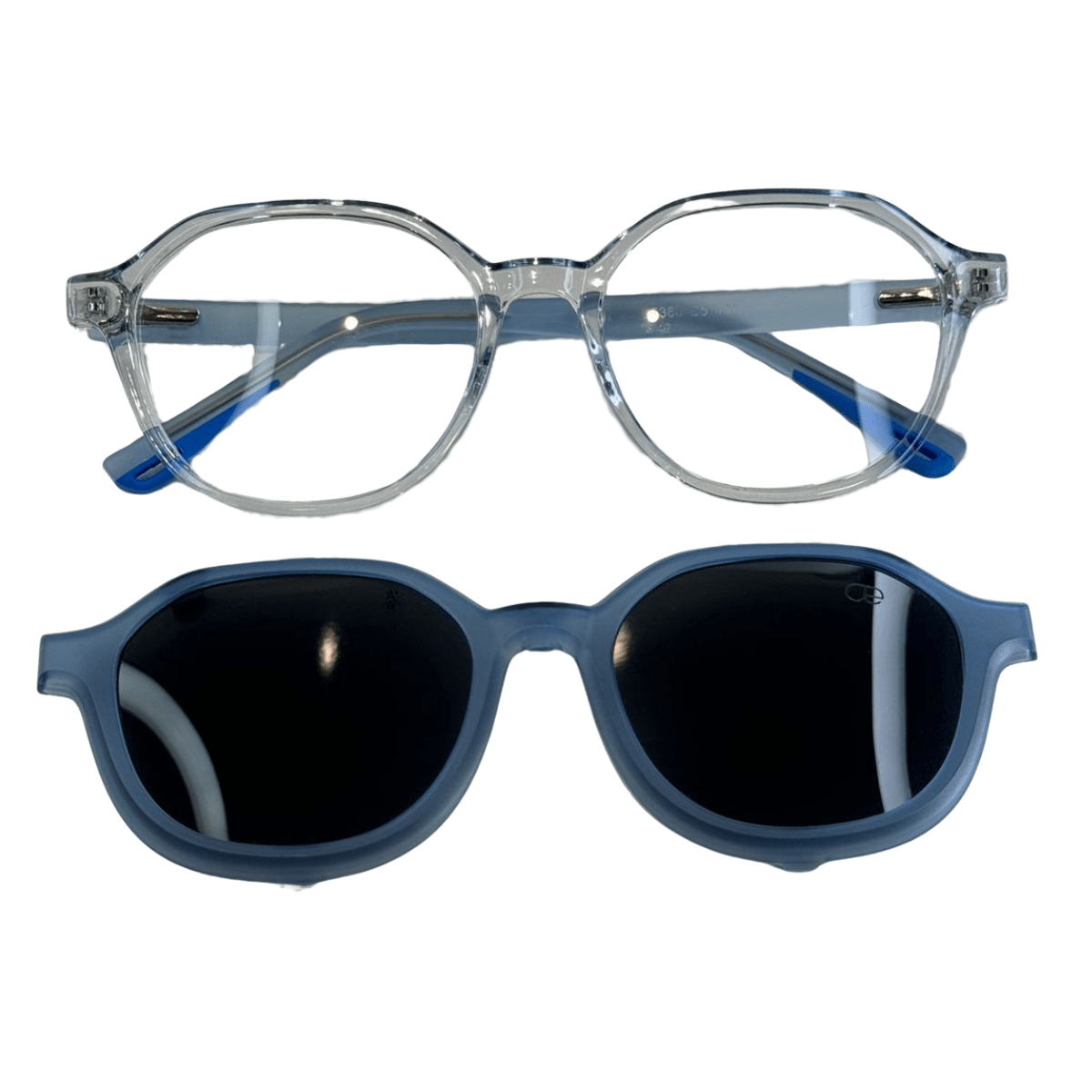 Óculos de grau infantil clip-on, modelo 2 em 1 em acetato com hastes em acetato, em formato hexagonal, o óculos Evolve é a escolha perfeita para quem busca praticidade, com um simples encaixe, a criança transforma seu óculos de grau em solar, garantindo conforto, estilo e proteção UV no dia a dia.