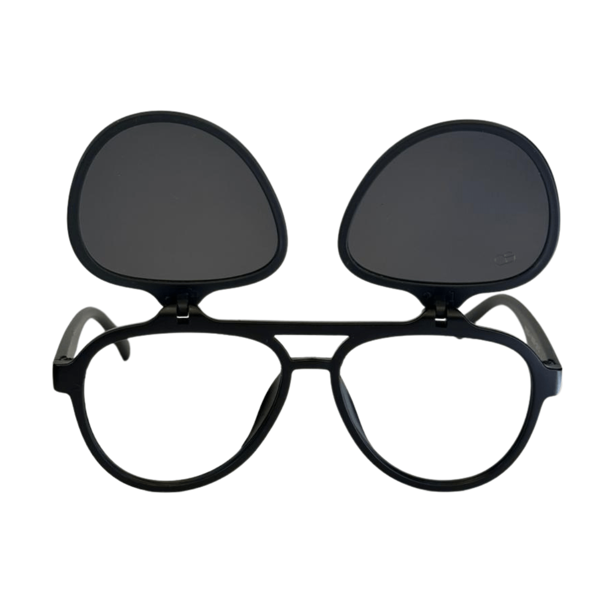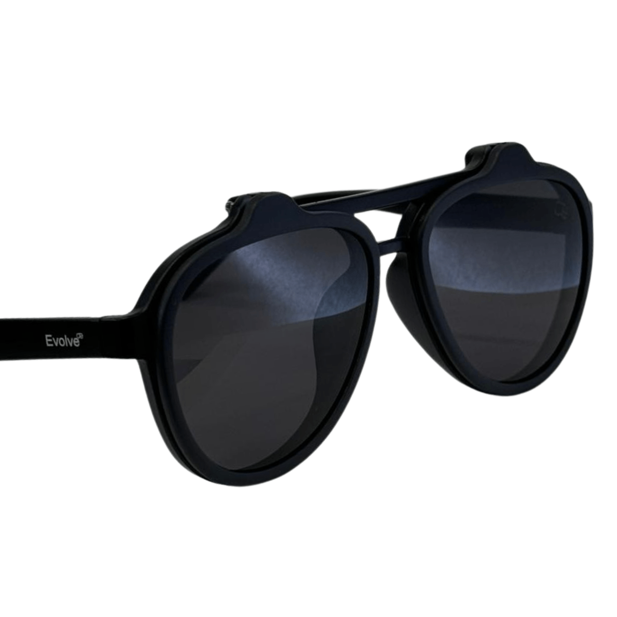 Óculos de grau infantil clip-on, modelo 2 em 1 em acetato com hastes em acetato, modelo aviador, o óculos Evolve é a escolha perfeita para quem busca praticidade, com um simples encaixe, a criança transforma seu óculos de grau em solar, garantindo conforto, estilo e proteção UV no dia a dia.