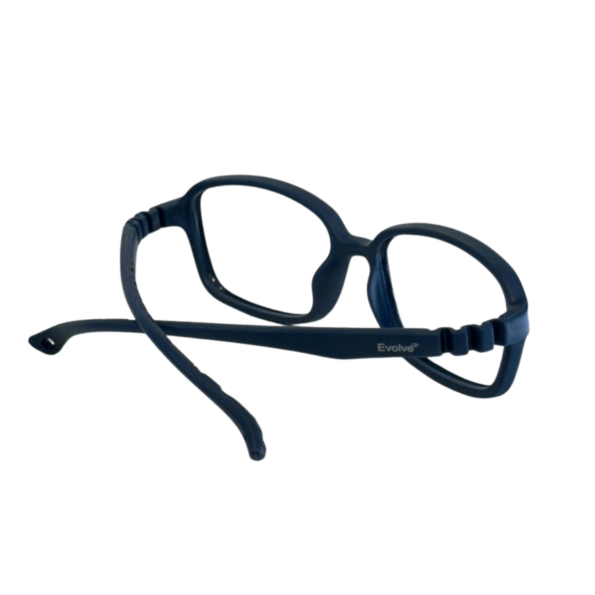 Óculos de grau infantil em tom de azul escuro, em acetato, com hastes flexíveis, em formato quadrado, o óculos Evolve é a escolha perfeita para oferecer o máximo de conforto, segurança e durabilidade no dia a dia das crianças. As hastes flexíveis garantem maior liberdade de movimento e resistência a quedas e torções.