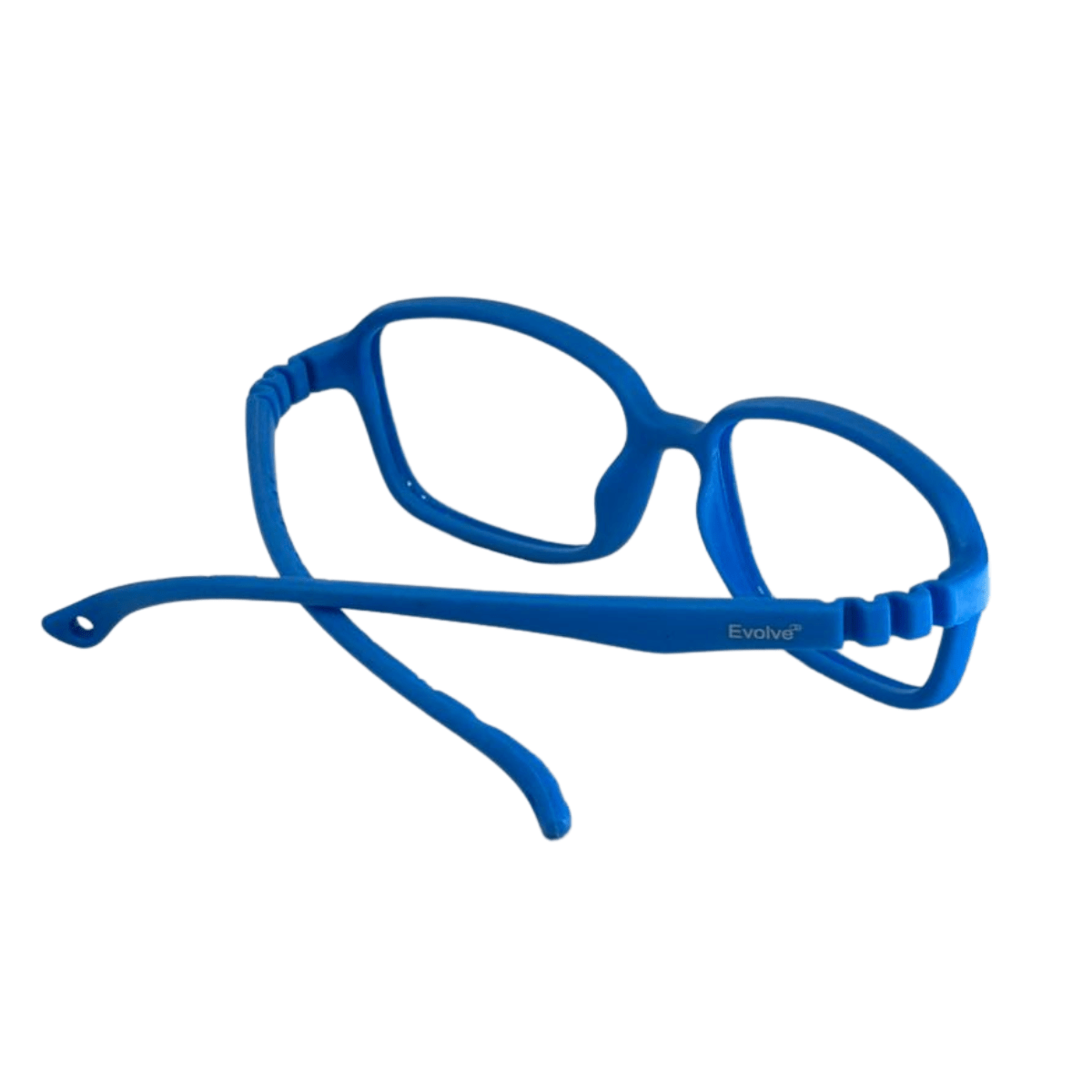 Óculos de grau infantil em tons de azul, em acetato, com hastes flexíveis, em formato quadrado, o óculos Evolve é a escolha perfeita para oferecer o máximo de conforto, segurança e durabilidade no dia a dia das crianças. As hastes flexíveis garantem maior liberdade de movimento e resistência a quedas e torções.