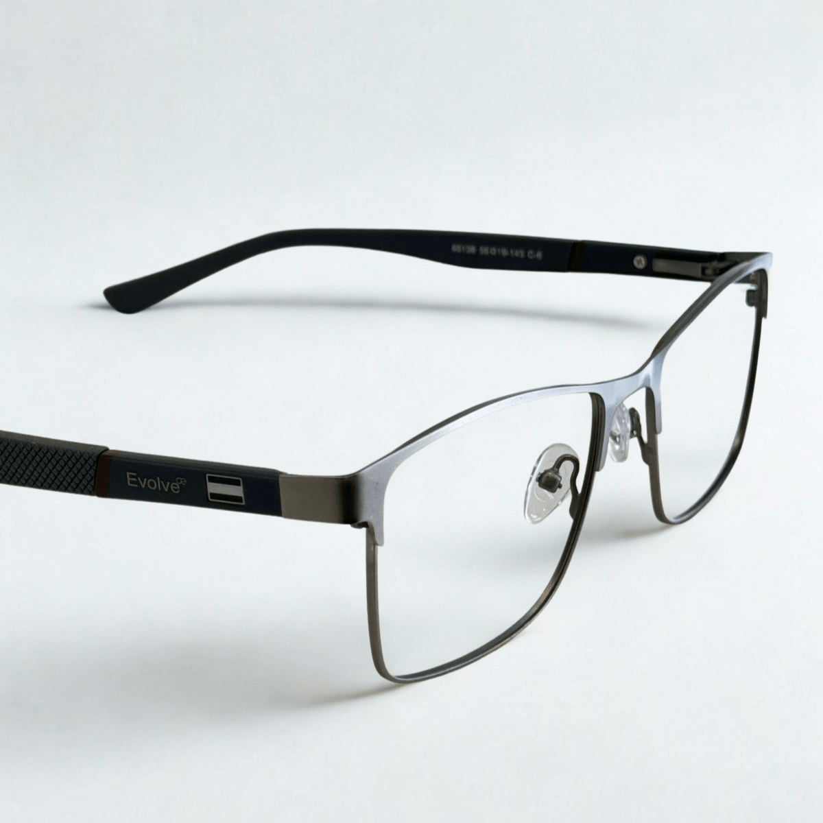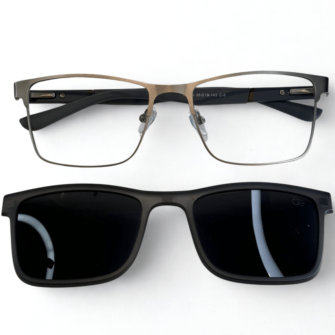 Óculos de grau masculino clip-on, modelo 2 em 1 em metal, com hastes em acetato, em formato quadrado, o óculos Evolve é a escolha perfeita para quem busca praticidade e elegância no dia a dia, pois sua versatilidade permite a troca rápida entre as lentes de grau e o clip-on solar.