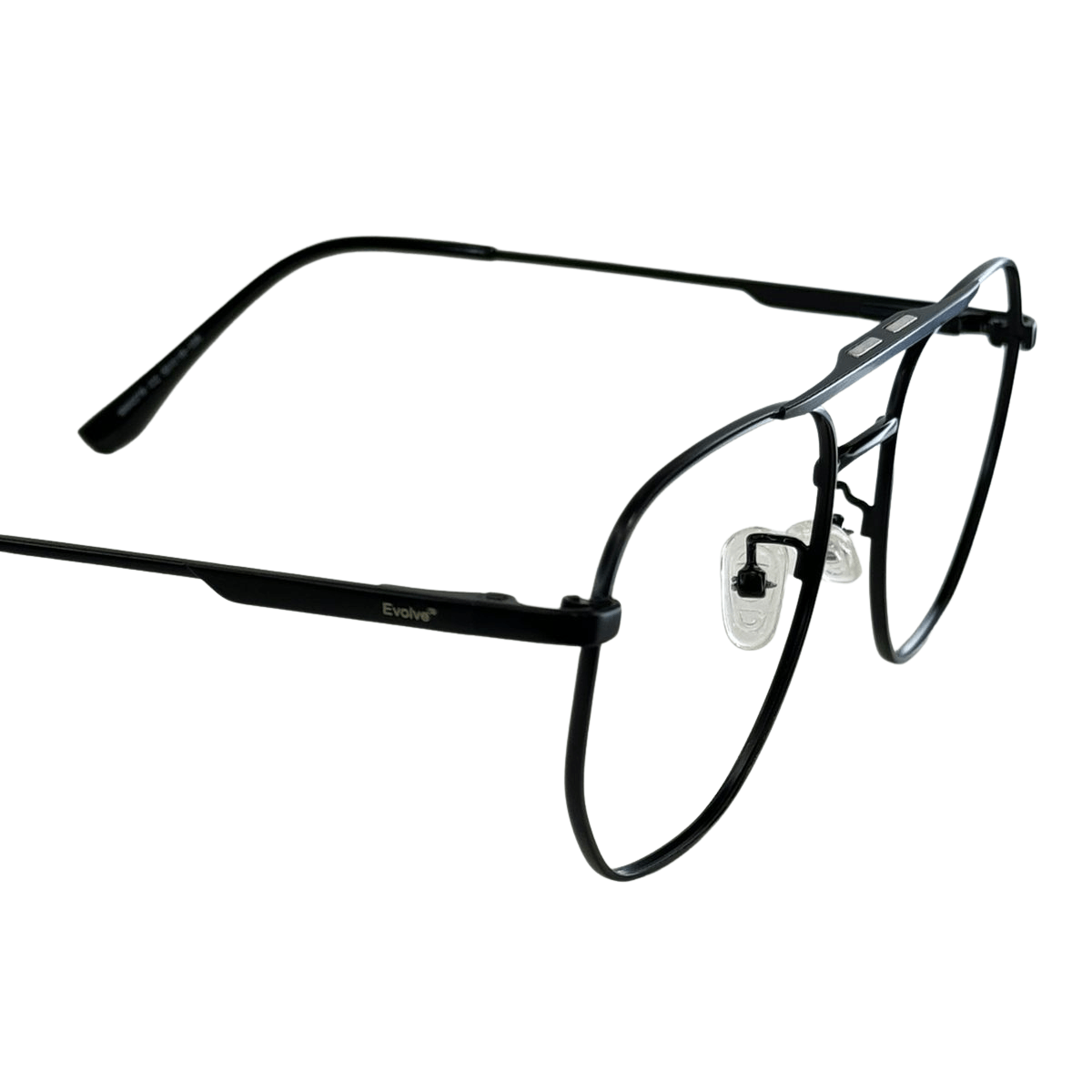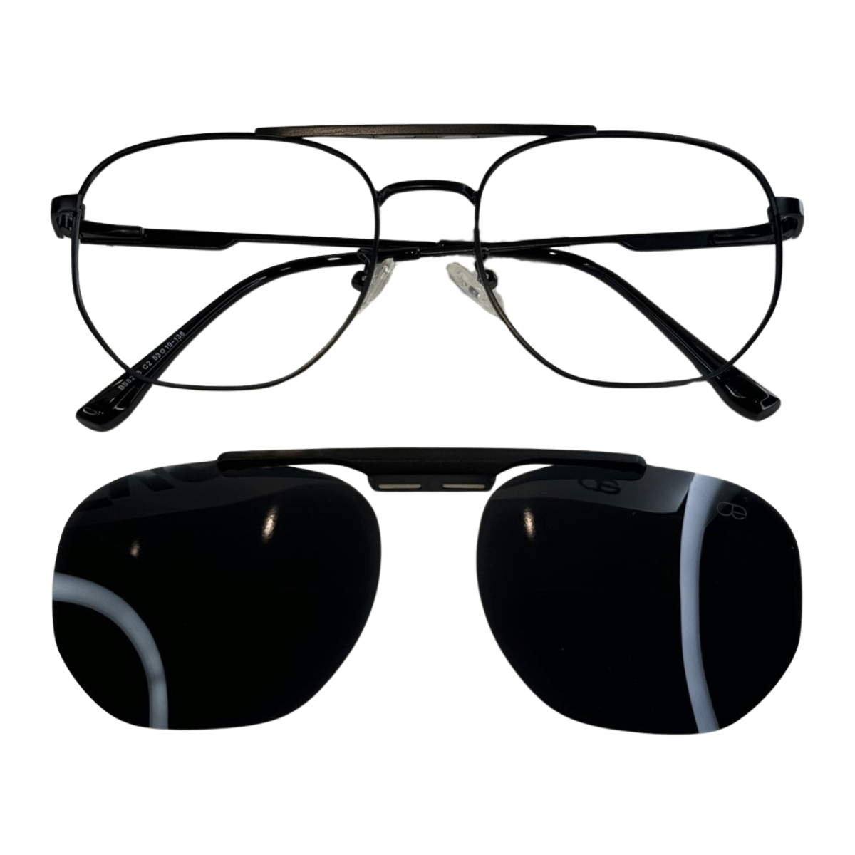 Óculos de grau masculino clip-on, modelo 2 em 1 em metal, com hastes em acetato, em formato hexagonal, o óculos Evolve é a escolha perfeita para quem busca praticidade e elegância no dia a dia, pois sua versatilidade permite a troca rápida entre as lentes de grau e o clip-on solar.
