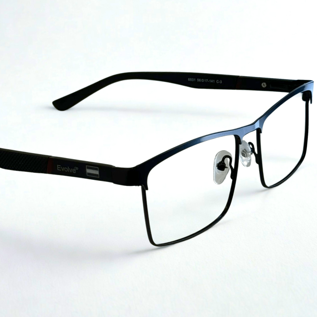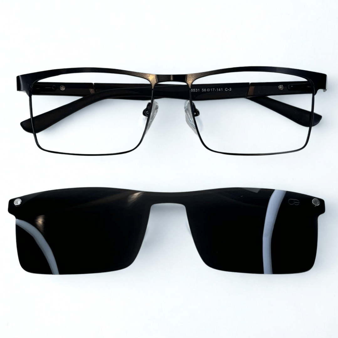 Óculos de grau masculino clip-on, modelo 2 em 1 em metal, com hastes em acetato, em formato quadrado, o óculos Evolve é a escolha perfeita para quem busca praticidade e elegância no dia a dia, pois sua versatilidade permite a troca rápida entre as lentes de grau e o clip-on solar.