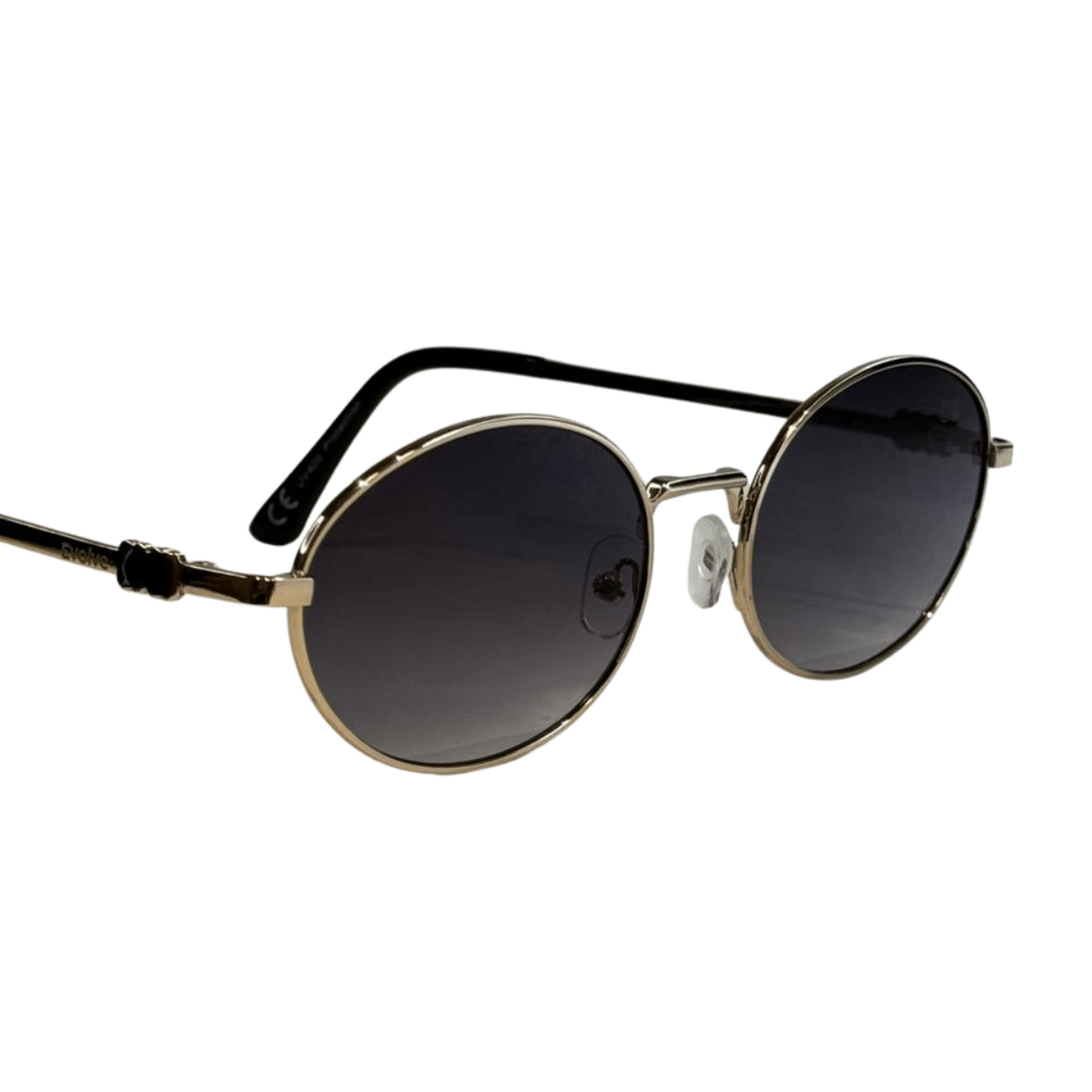 Óculos de sol feminino, modelo oval em metal, com hastes também em metal, com lentes cinzas em degradê, tem um design sofisticado e atemporal que é sucesso no momento. Seu formato confere um visual moderno e elegante, perfeito para quem gosta de se destacar com estilo.