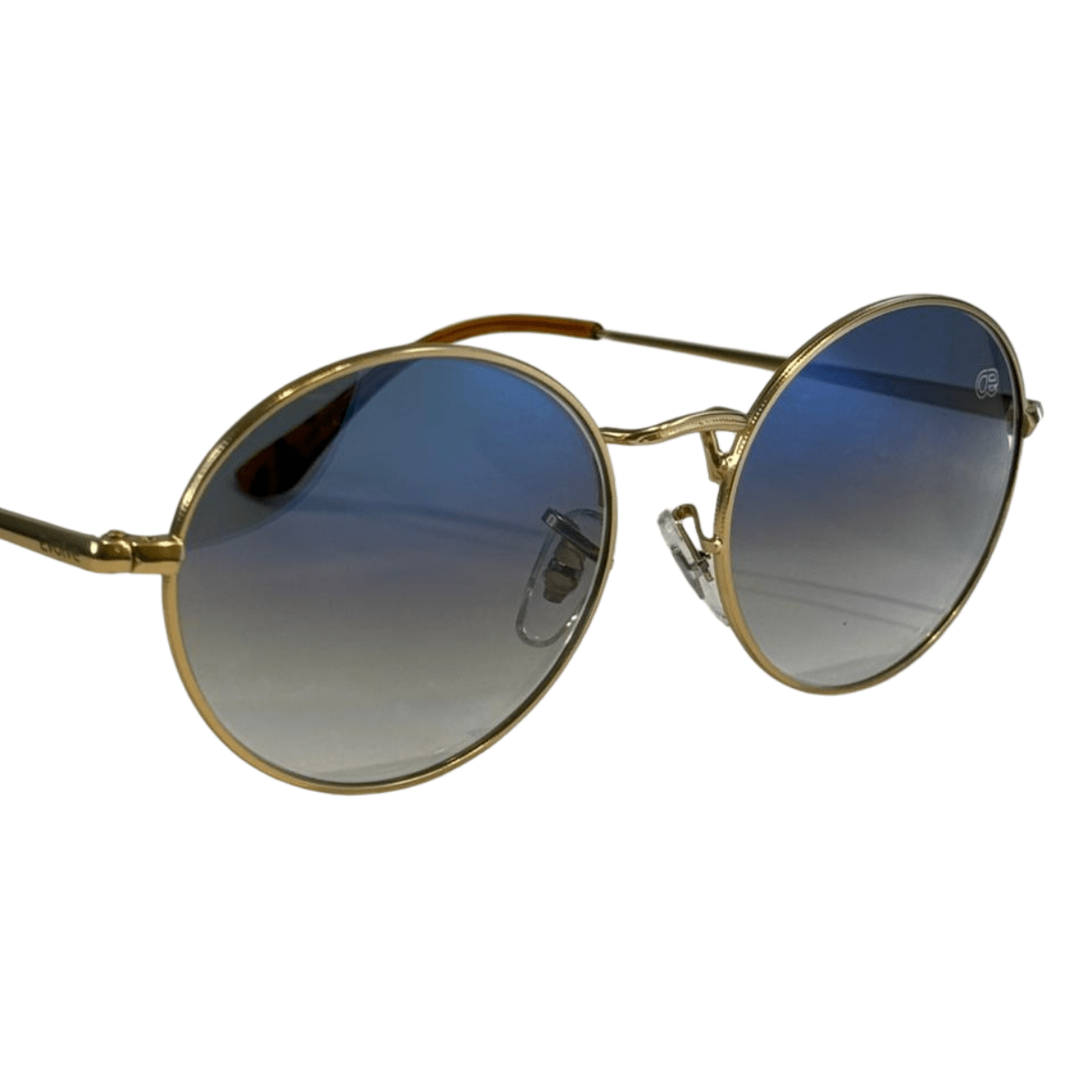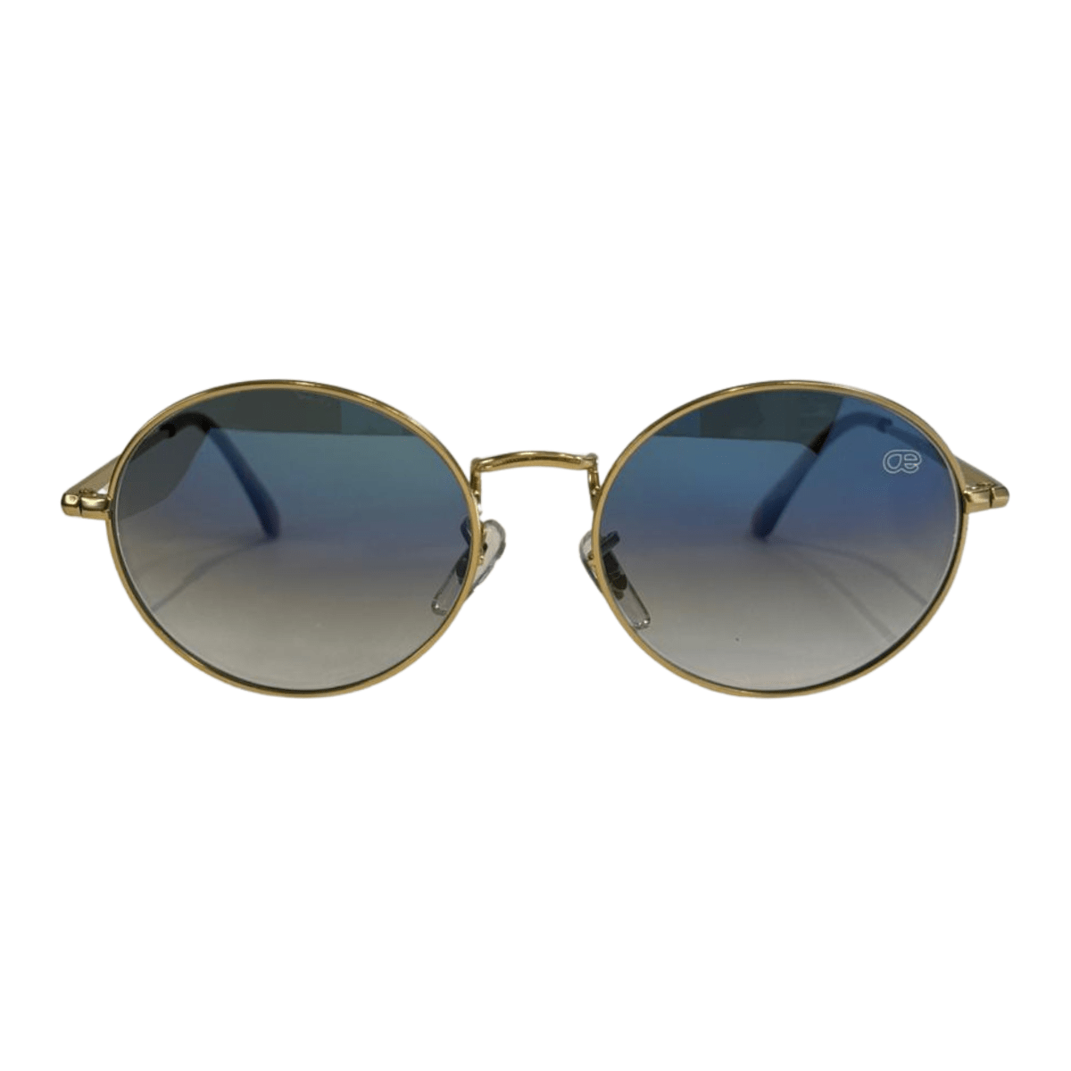 Óculos de sol feminino, modelo redondo em metal, com hastes também em metal, com lentes azuis, tem um design sofisticado e atemporal que é sucesso no momento. Seu formato confere um visual moderno e elegante, perfeito para quem gosta de se destacar com estilo.