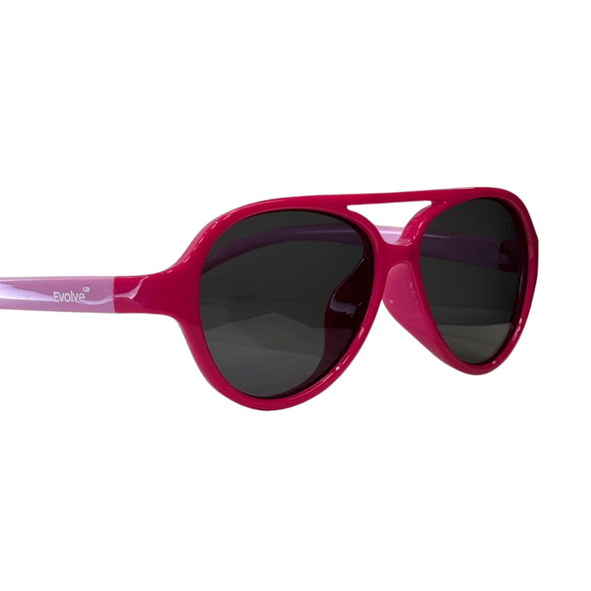 Óculos de sol, modelo aviador em acetato, com hastes em acetato em rosa, o óculos Evolve é a escolha perfeita para deixar as brincadeiras ao ar livre ainda mais seguras e cheias de estilo com o Óculos de Sol Infantil.
